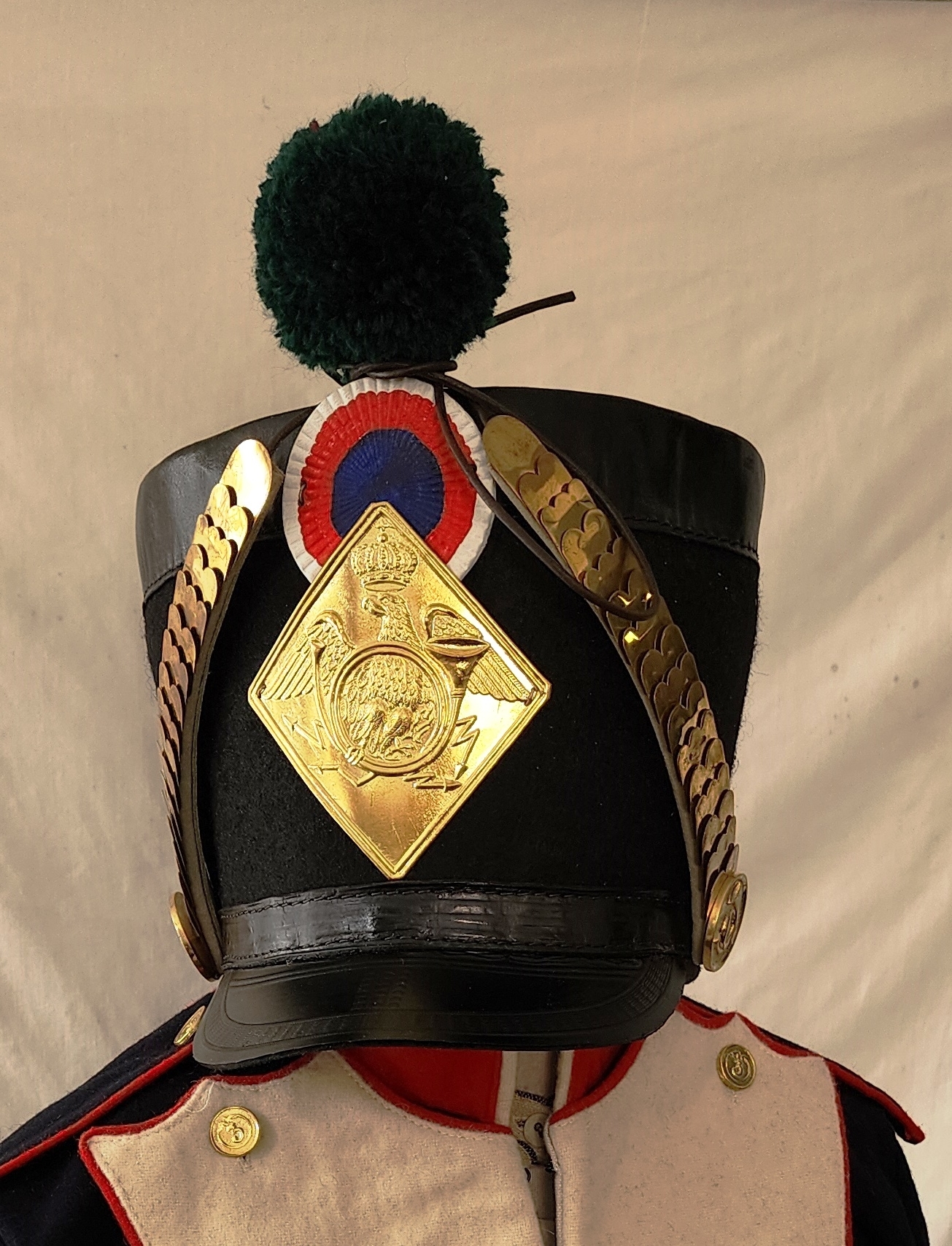 1810 Shako. Wool felt,leather brim, Brass 1806 plate , cockadge and pom pom, (chin scales and bosses sold separately) Made to order 5-7 weeks production .