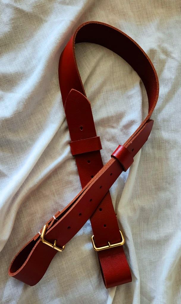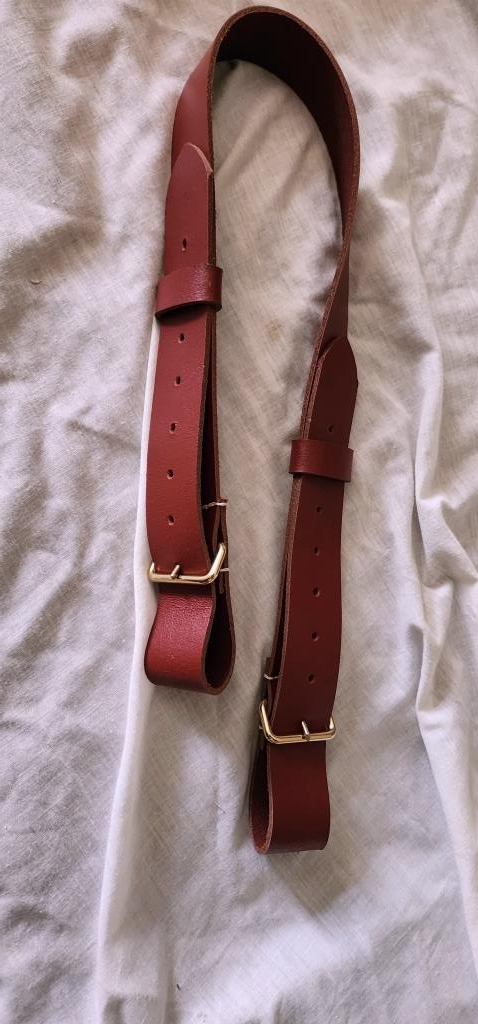 Prussian Potzdam 18th – 19th century Musket sling dark Red leather with two buckle system as described by G C Neumann and Frank J Kravic Encyclopedia of the American Revolution. Made to order 2-3 weeks , due to the variety of types need measurement from musket sling swivel to swivel.